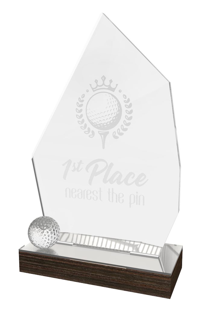 Introducing our stunning in-house design that flawlessly blends premium acrylic with real wood to create the Golf Trophy. Meticulously crafted with precision, this award boasts an impressive 8mm thick acrylic top mounted on a 4-ply birchwood base, complete with a crystal golf ball. The acrylic top is expertly fitted to the base, resulting in a unique and polished finish that is sure to leave a lasting impression.