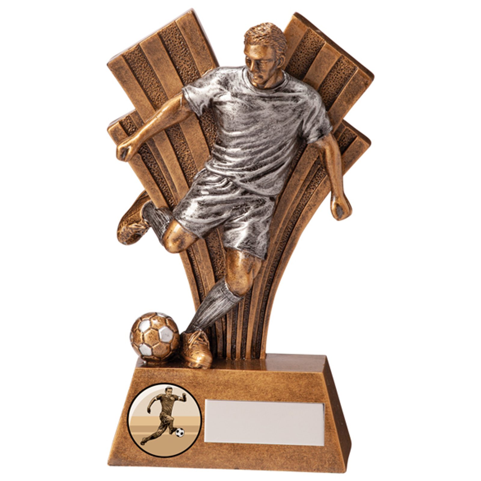 The Xplode Football Player Trophy is a high definition 3D design made from top quality resin, with beautifully displayed detail. Glazed in a stunning colour mix of antique silver and gold.