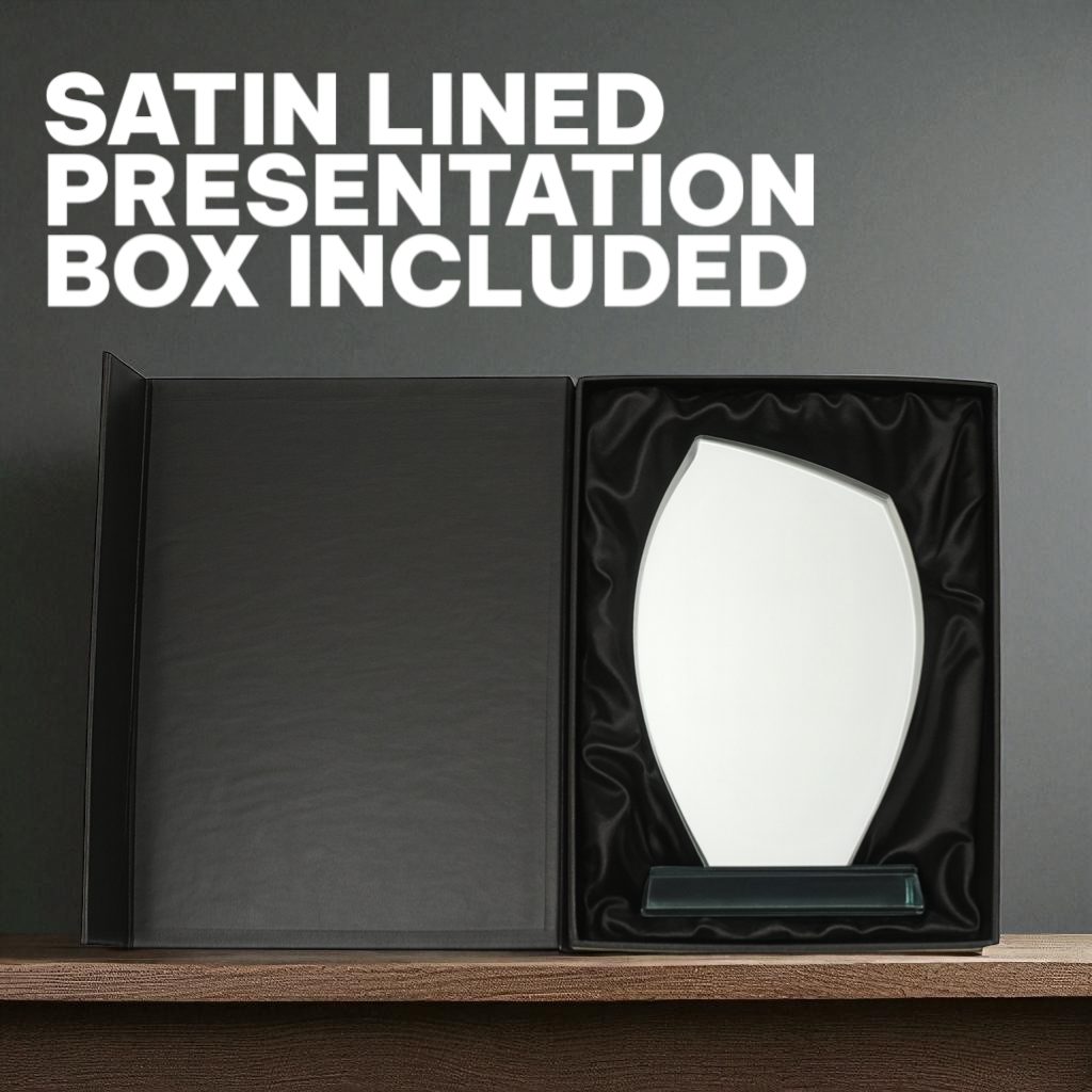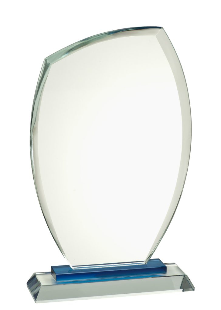 The Zenith Glass Award is a contemporary and eye-catching design, made from 10mm thick premium glass and mounted on a double-layered glass base, featuring a striking blue top layer. Available in 190mm, 220mm, and 250mm sizes, it is supplied in a luxury presentation box.